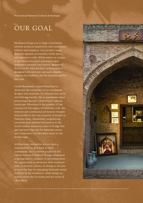 Khazineyi is rooted in a traditional craft hujra located in the Walled City of Lahore, near Delhi Gate, within the courtyard of Masjid Wazir Khan.Inspired by centuries-old frescoes and architecture, we create handcrafted art that brings heritage into contemporary spaces.