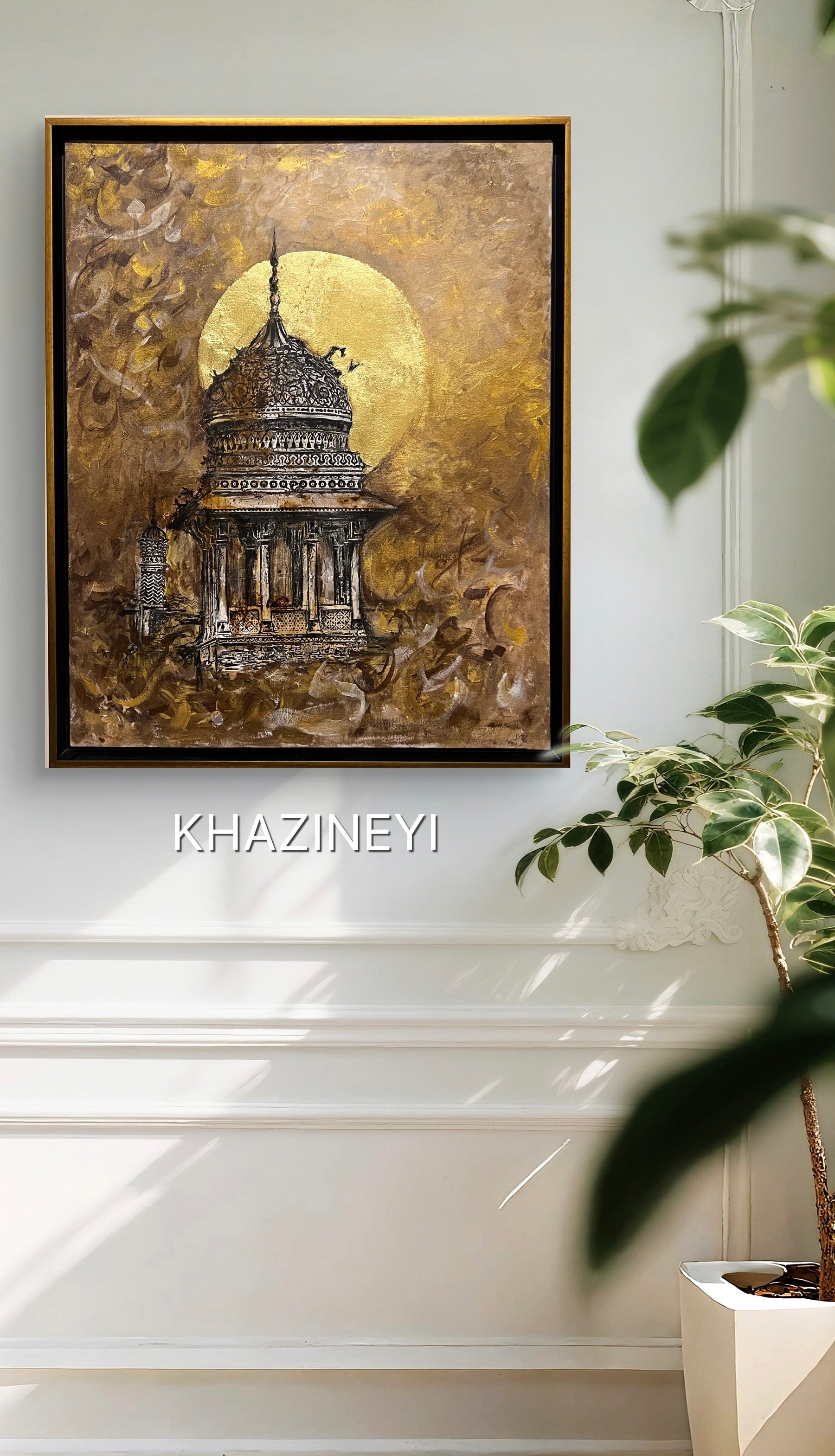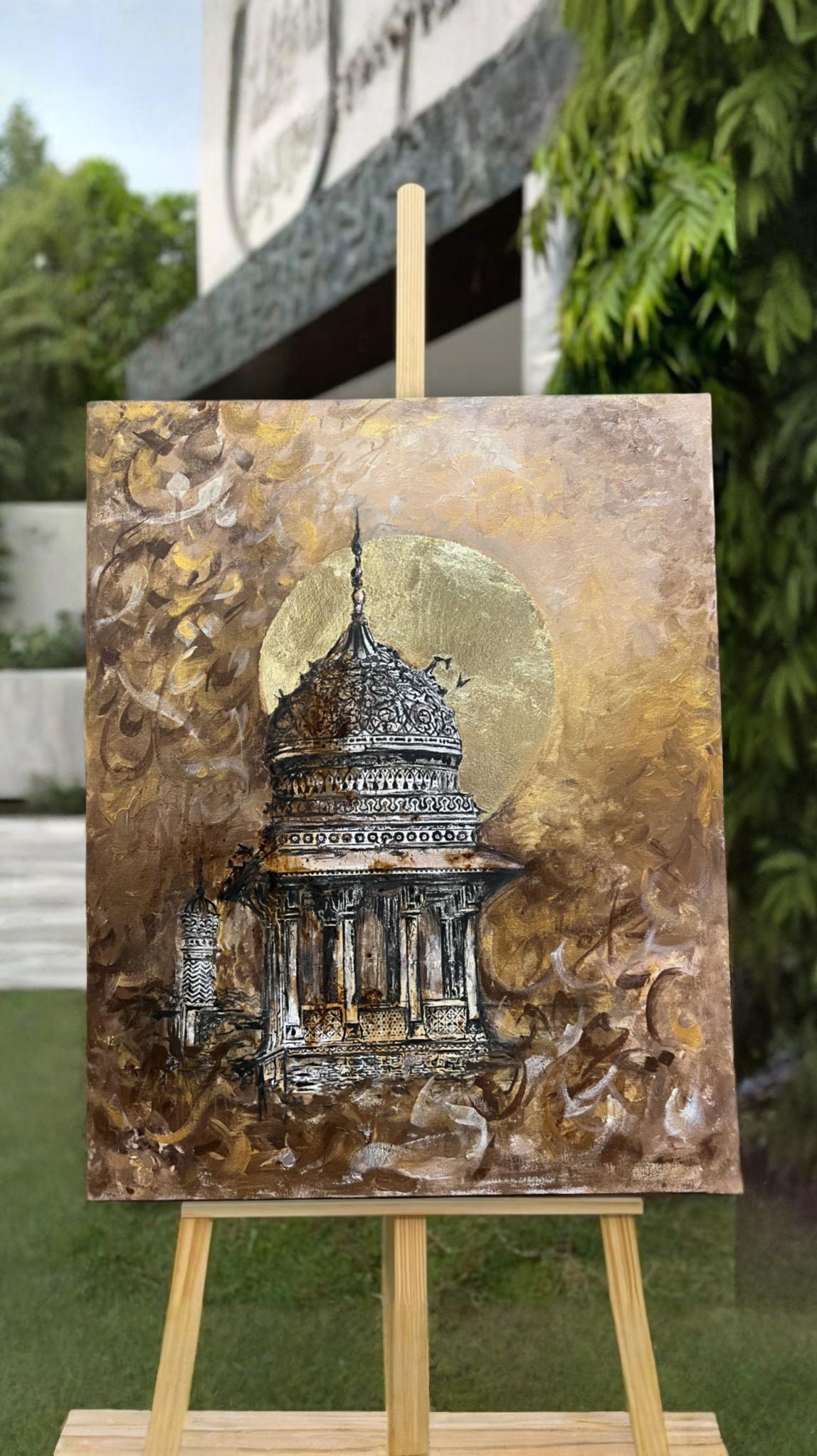 A luminous tribute to Lahore’s timeless artistry, this painting captures the intricate dome of Masjid Wazir Khan against a swirling, textured backdrop of gold and earthen tones. The architecture, rendered in delicate black ink, stands in dialogue with the rich metallic surface — where every stroke of gold leaf echoes divine illumination and the sacred craft of Islamic ornamentation.